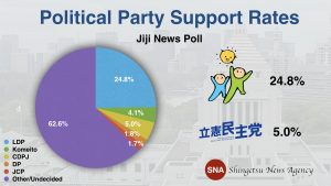 —The latest Jiji poll, which always shows relatively low party support rates compared to other polls, finds, among opposition parties, the Constitutional Democratic Party of Japan at 5.0%, the Democratic Party at 1.8%, the Communists at 1.7%, and the Party of Hope with, OMG, only 0.9%