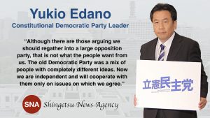 —Constitutional Democratic Party of Japan leader Yukio Edano is once again forced to shoot down the notion that his new progressive party will combine with more conservative opposition parties. The Democratic Party, in particular, can’t seem to catch the drift.