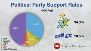—According to latest Nippon News Network poll, Japan’s progressive opposition parties are now stomping the more conservative opposition parties: Constitutional Democratic Party of Japan 10.5%; Japan Communist Party 4.3%; Democratic Party 2.4%; Japan Innovation Party 1.6%; Party of Hope 1.2%.