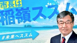 —Nago Mayoral Race: Incumbent anti-base candidate Susumu Inamine emphasizes the city’s pristine beaches in his campaign graphic, like Henoko beach that is scheduled to be destroyed by the construction of the US Marine air base.