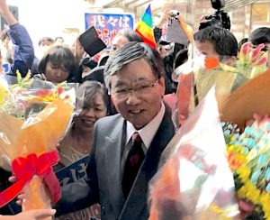—For eight years Susumu Inamine led the anti-base movement in Nago. Today his supporters turned out to cheer him as he departed his resignation ceremony at Nago City Hall. Blue sign in the background declares, “We’ll Never Give Up!” Photo from lawmaker Keiko Itokazu.