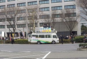 —Finance Minister Taro Aso cries foul about this truck used in Friday’s Moritomo Gakuen demonstration. He asserts it’s “not normal” for such a truck to be used in a demonstration that was allegedly organized by a citizens’ group. He sees the hand of official opposition parties.