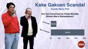 —Just over 13% of the Japanese public finds Prime Minister Shinzo Abe’s denials of any wrongdoing in the Kake Gakuen affair to be credible. That means that even most Japanese conservatives now think there was some hanky-panky involved.