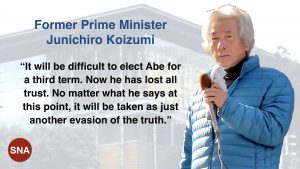 —Former Prime Minister Junichiro Koizumi makes clear that he doesn’t think that Shinzo Abe should remain prime minister past September. He opposes a third party presidential term for Abe. He gives Abe a little push down the stairwell as the Abe regime stumbles toward its inglorious, scandal-ridden end. This is the same Koizumi who once agreed to make Abe a protege and handed over the prime ministership to him while still riding high in 2006.