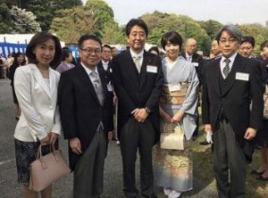 —A lot of the theories about the collapse of Japan Times swirl around Publisher & Chair Minako Kambara Suematsu, whom some allege is close to Prime Minister Shinzo Abe. She has, at minimum, taken photographs with Abe and posted them on her blog (she is in the gray kimono).