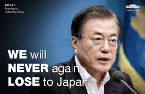 —Moon Jae-In hits back: “This is a very reckless decision that rebuffs diplomatic efforts to resolve the problem and further exacerbates it… The Korean government will resolutely take corresponding measures in response to Japan’s unjustifiable economic retaliatory measures… These moves by the Japanese government carry a clear intention to attack and hurt our economy by impeding our future economic growth. It is disappointing and regrettable that Japan, which has been regarded as our closest neighbor and friend, has taken such measures.”
