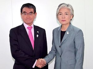 —South Korean Foreign Minister Kang Kyung-Wha’s icy expression as she shakes hands with Foreign Minister Taro Kono says it all about the current state of Japan-South Korea relations.