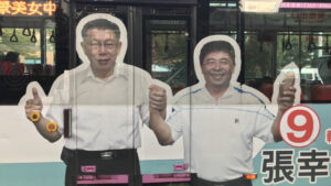Ko Wen-je (left) pictured on the side of a Taipei bus with Zhang Xing-song, a candidate for the Taiwan People’s Party