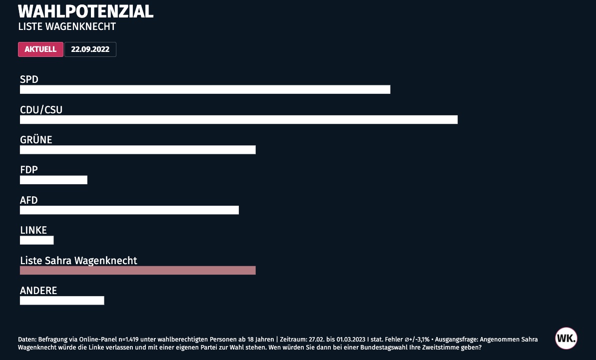 At least one poll, conducted by Berlin-based Wahlkreisprognose, found at the beginning of this month that a hypothetical party led by Wagenknecht would currently gather 14% of the nation’s party vote, placing it tied at third with The Greens and far ahead of The Left. This seems to indicate that many in Germany are open to her message about the need for a pro-peace diplomatic agenda.