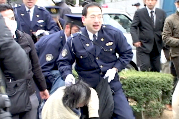 Protesters against Okinawa military base treated roughly by police outside US Embassy in Tokyo, including one man pulled across the road by his hair.